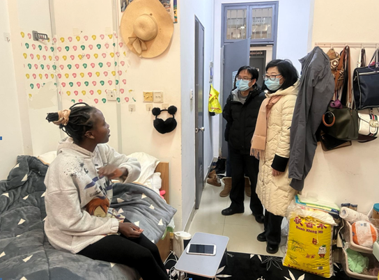 12月29日下午,金沙2004路线js5党委副书记金坚强、副院长陈三妹在学生科相关老师陪同下,看望慰问寒假留校国际生。