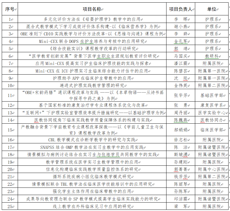 近期,学校先后公布2021年度校级教学改革研究项目立项名单,全校共计立项60个,金沙官网获批25个,期中10个为医学教育教学改革专项、10个为附属医院专项、1个为教学管理专项、4个为课改立项。(教研科 马国庆)