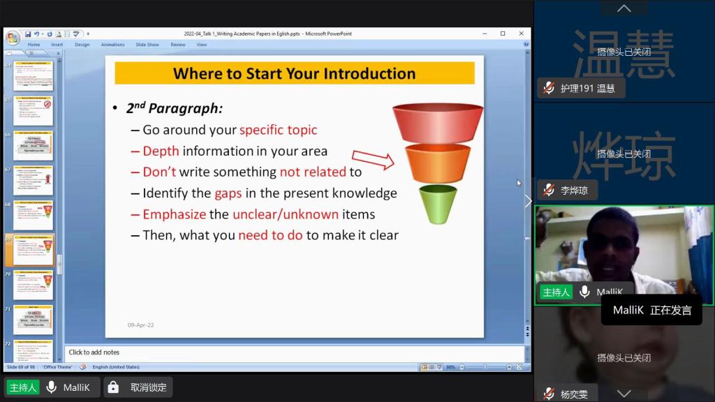 4月9日,康复医学系邀请浙江师范大学MALLIKARJUNA KORIVI教授为金沙官网康复治疗学和护理学专业同学开展“科研论文撰写”线上主题报告。MALLIKARJUNA KORIVI教授总结自身多年科研论文撰写经验与心得,在两个多小时的讲座中围绕“为什么要撰写科研论文”、“科研论文撰写流程”以及“科研论文撰写注意事项”三方面,详细介绍了论文标题设计、摘要凝练、引言陈述、正文铺叙、结论与展望、参考文献选择等各个环节要点,重点强调了论文题目设计重要性。最后,他提出科研论文撰写是同学们今后专业发展中必备素质,鼓励大家善总结、多动手,要勇于尝试并积极撰写科研论文。