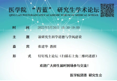 5月26日晚,金沙2004路线js5“青蓝”研究生学术论坛首讲通过钉钉平台在线上举行,金沙2004路线js5张建华教授作题为”研究生科学道德与学术规范“的讲座。活动由院研究生会科技部承办,临床医学专硕全体研究生以及部分本科生参加了本次活动。