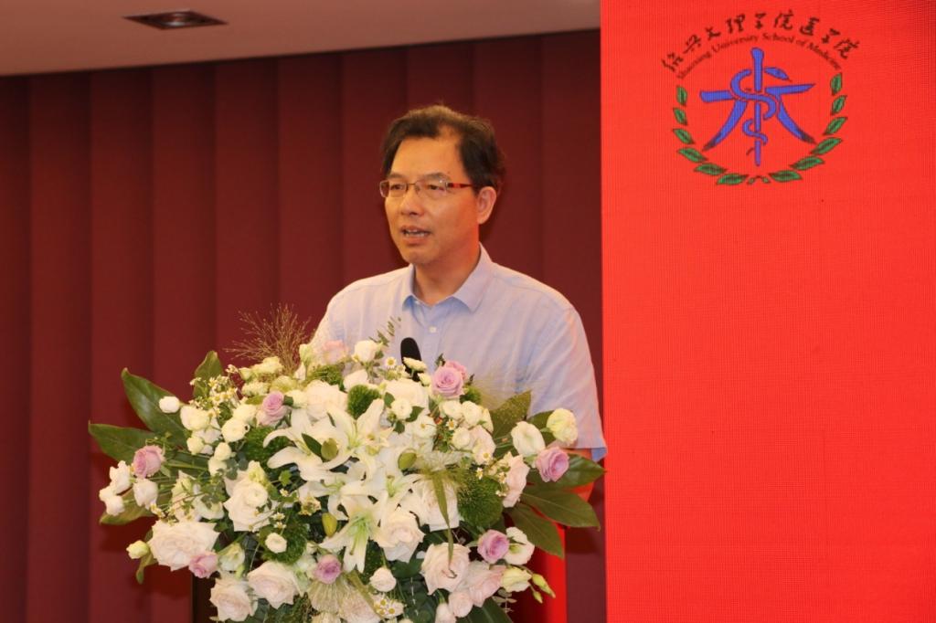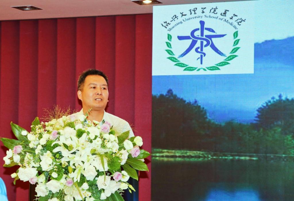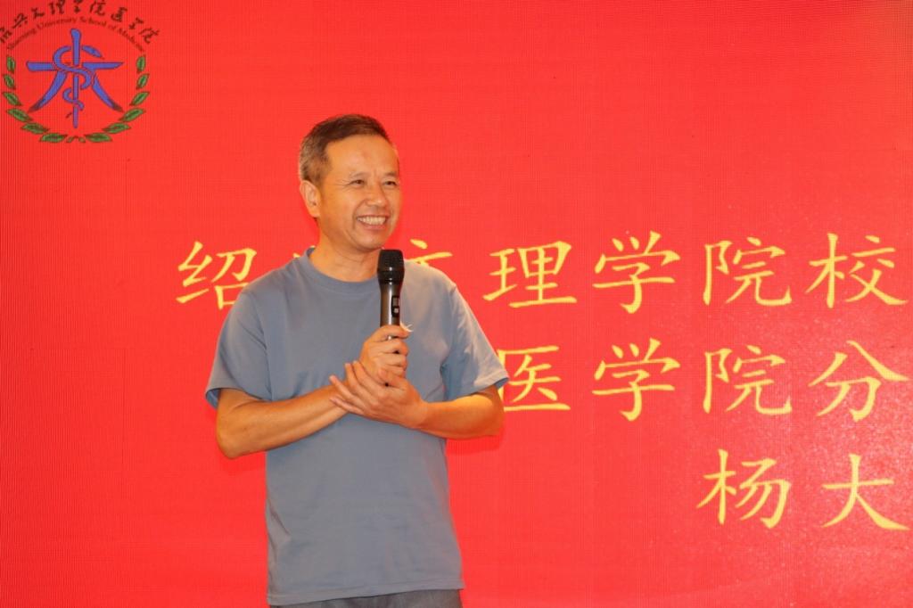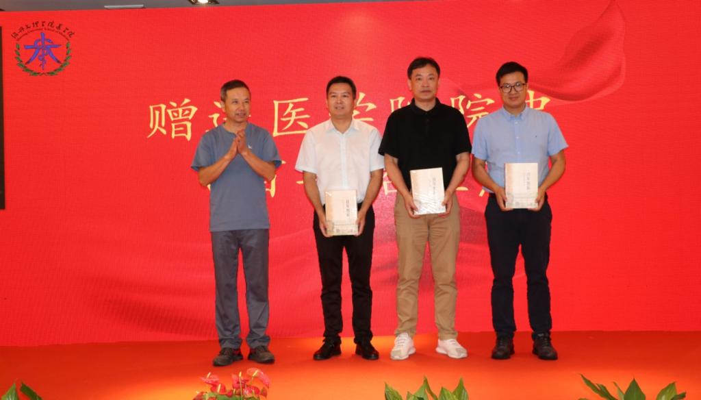 杨大明为校友代表赠送金沙2004路线js5院史《百年绍医》。