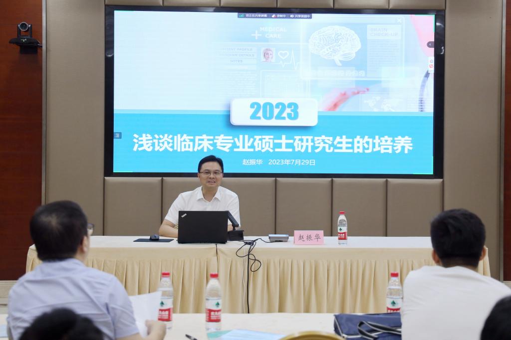 赵阳讲话。他对金沙2004路线js5近年来取得的成绩表示肯定,他希望金沙2004路线js5能坚持卓育英才,加快医学人才培养模式创新,围绕立德树人根本任务,遵循医学教育办学规律和医学人才成长规律,以新医科建设为抓手,积极探索“医学+”人才培养模式,努力培育复合型拔尖创新医学人才,树立学科融合的育人新理念,构建德才并重人才培养新路径,培养“五术”兼备新时代医学人才;要深化医教协同,加强医校育人共同体建设,进一步统筹校院两级资源,通过政策配套、资源供给和指导协助等支持医学教育高质量发展,进一步完善医教协同机制,完善学校、金沙2004路线js5、附属医院管理运行机制,推进本科教学质量常态监测联动机制建设,进一步发挥附属医院作用,强化附属医院临床教学职能,完善医学教育评价体系,加强师资队伍建设,共同引育高层次人才和开展高水平科研;提增发展优势,推进高水平新医科建设,充分发挥综合性大学办金沙2004路线js5的显著优势,聚焦学科结构提质增效,面向人民生命健康,落实“大健康”理念。