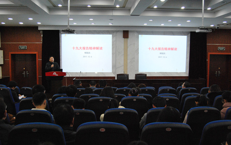 为了深入学习贯彻党的十九大精神,扎实做好新时期高校教育各项工作,12月6日下午,学院组织全院教职工和学生党员在财贞楼报告厅举行党的十九大报告精神解读会。校党委委员、院党委书记柳国庆做专题报告。
