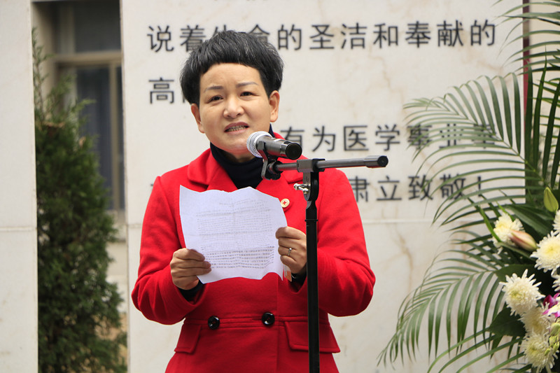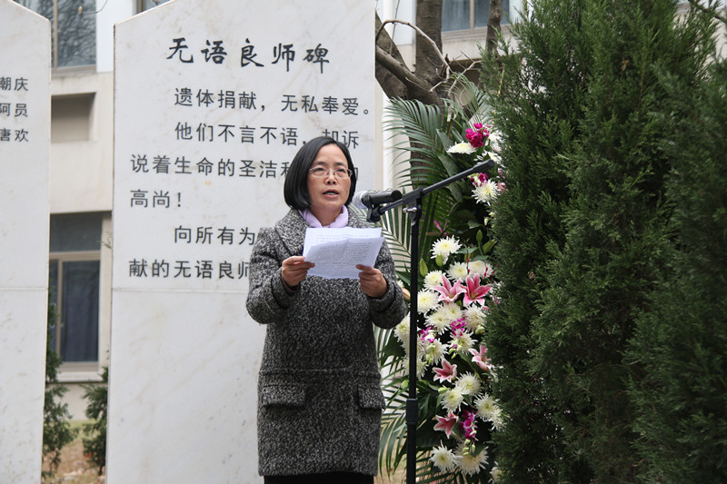 遗体(器官)登记志愿者代表冯莉女士在讲话中盛赞志愿者们无私奉献的大爱善行。她说,所有“无语良师”的生命都将在奉献中得到延续,他们的大爱精神都将借着新一代的医师,回馈到更多的患者身上。她呼吁所有人都积极参与到遗体组织捐献事业中,将这种奉献和大爱的精神传承下去,升华自己,成全他人,让生命永续,让爱永存!