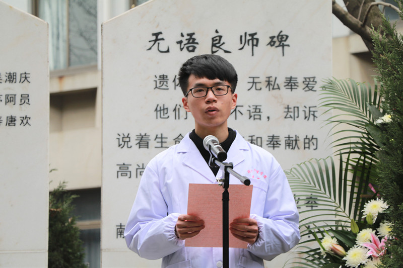 蒋盼若同学在发言中向“无语良师”及其家属表达了崇高的敬意,正是因为有了“无语良师”的付出和奉献,学子才能更加全面、直观的学习医学知识,医学教育事业的发展才能更加迅速、超前。在“无语良师”纪念碑前,他代表全体金沙2004路线js5学生立下誓言:我们定将竭尽所能学习医学知识,扎身于科学研究,培养高尚的医德情操,绝不辱没无语良师给予我们的恩赐!