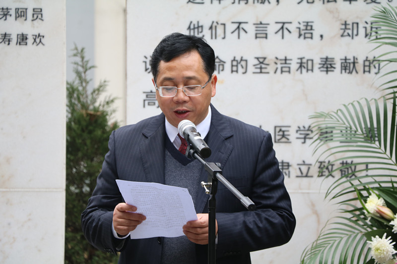 郑杰副会长在致辞中说,纪念碑上闪耀着逝者的名字,他们生前来自各行各业,但都选择了身后馈赠给医学事业或他人一份生命的礼物,展现了人性最耀眼的光辉,造就了他们不平凡的人生,这种精神永远值得尊重和缅怀。随着社会的进步,遗体捐献志愿者报名登记人数增多、捐献者家属也给予了理解和支持,这是促进医学事业、红十字事业和社会事业发展的重要力量。希望通过对遗体捐献者的纪念和宣传,弘扬无私捐献的社会风尚和“人道、博爱、奉献”的红十字精神,让更多的爱心人士支持和参加到这项公益事业中。