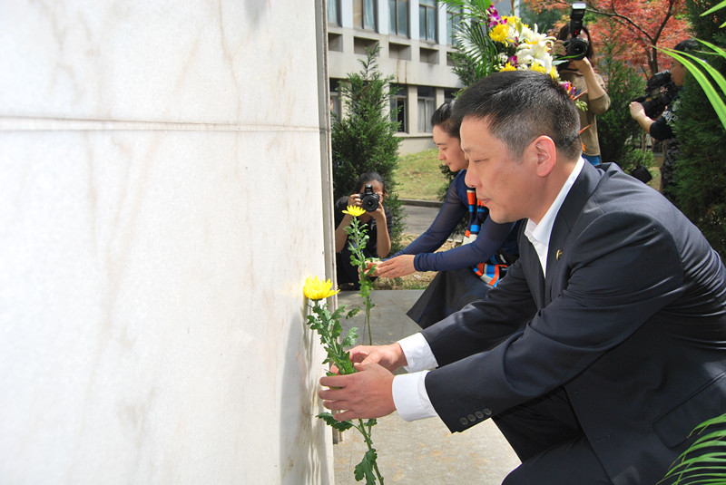 活动现场,学生代表向“无语良师”纪念碑敬献花篮,全体人员向捐献者们行三鞠躬。